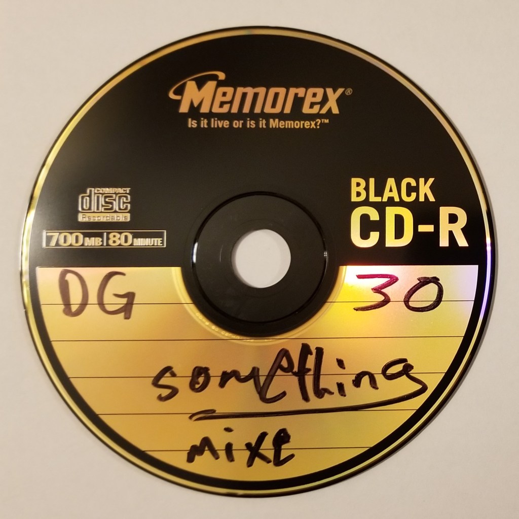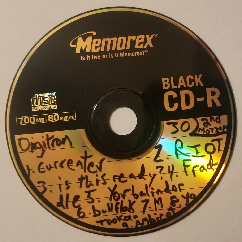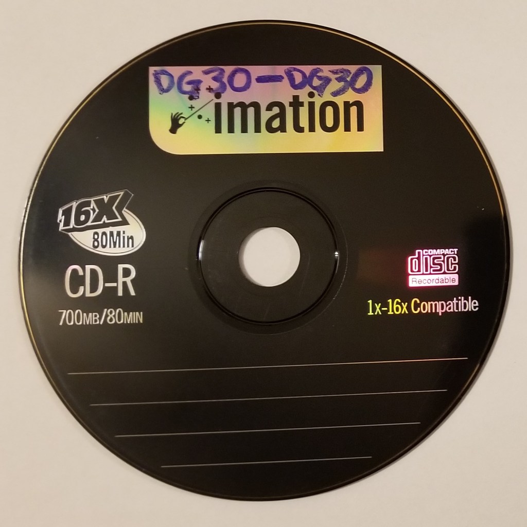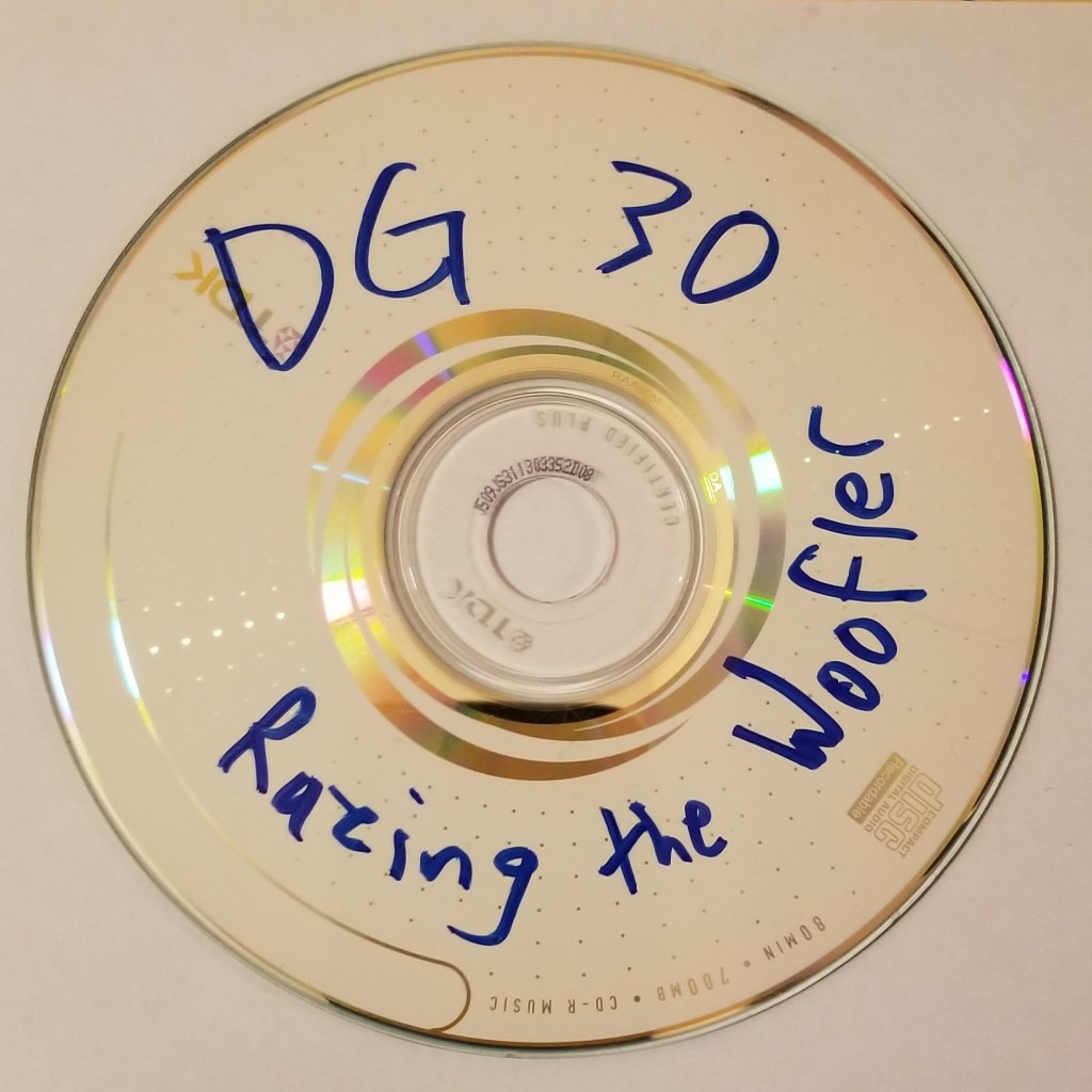 The first batch of ripped archival tracks were somehow grouped into “albums” in the media system, producing a set of tracks collected under the “album” title “DG30,” another as “Razing Suspicion,” and then there were a few loose tracks, one of which (“Drunk in Fase”) was apparently part of “Second Motion” though it is not on the extant CD-R that is titled, with black permanent marker right on it’s surface, “2nd Motion.” But the CD-R of 2nd Motion had not yet been rediscovered at the time, so how this track ended up in the digital music library as part of an album called “Second Motion” remains unclear.